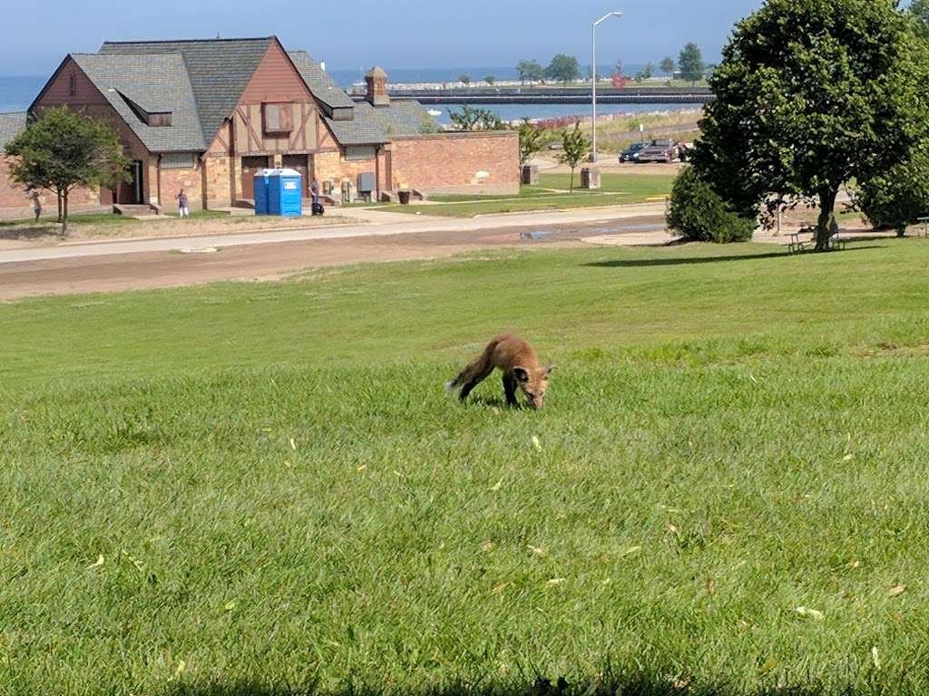 A beautiful park on Lake Michigan with a beach, lighthouse, and picnic tables, as well as pathways and a playground.